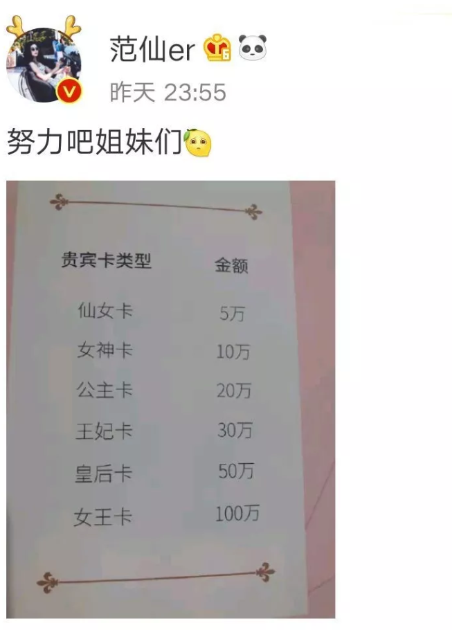 當(dāng)然,范冰冰美容院開(kāi)業(yè)后,大家也關(guān)注了一個(gè)問(wèn)題,那就是消費(fèi)到底是什么水平。而后,就有一位微博認(rèn)證為范冰冰超級(jí)粉絲的網(wǎng)友,她發(fā)博曬出了店里的貴賓卡消費(fèi)標(biāo)準(zhǔn),并喊話大家要努力。