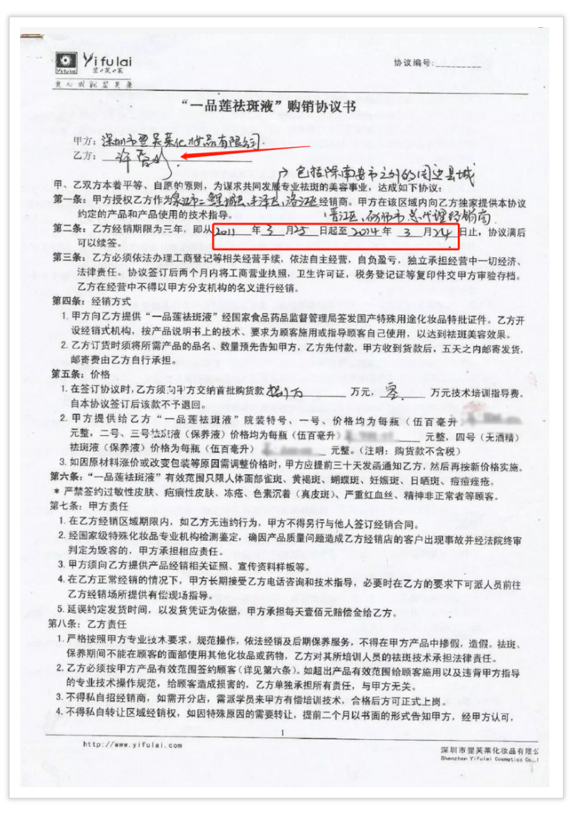 此公司全稱為翌芙萊(廈門)生物科技有限公司,法人代表許愛珍,許愛珍于2011年3月25日簽約翌芙萊購銷協(xié)議,為深圳翌芙萊化妝品有限公司經(jīng)銷商。