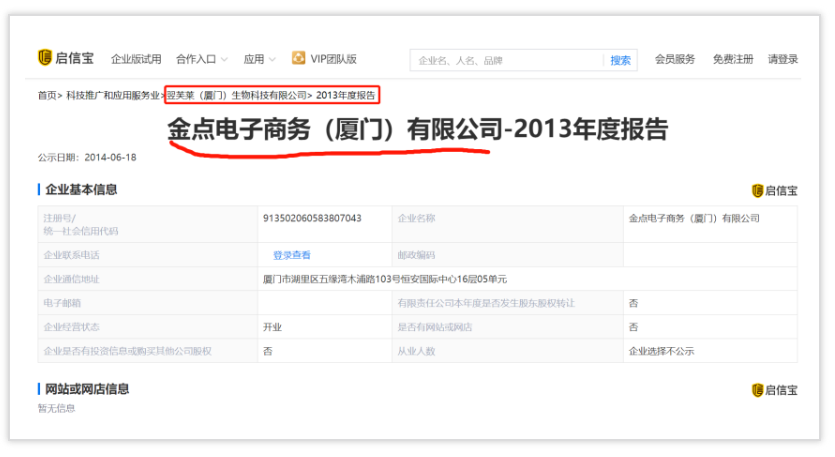 更可笑的是,在2014年的企業(yè)年報(bào)顯示,這家廈門翌芙萊的公司前生是一家叫做:金點(diǎn)電子商務(wù)(廈門)有限公司,可想而知做了兩年加盟商后就開始策劃走假冒品牌的路子。